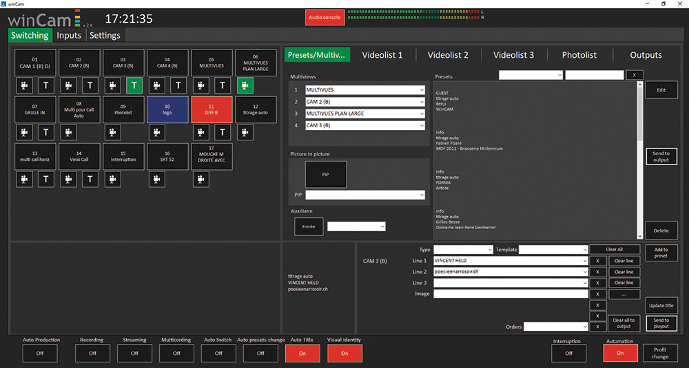 winCam offers automatic video camera management and production solutions specific to Radio, TV and event environment. It’s an all-in-one UHD multimedia video control room that features a powerful video engine, controls the most commonly used PTZ cameras, and is able to integrate with all broadcast consoles and automation software. winCam is meant to cover a broad range of needs expressed by broadcasters that want to switch from Radio to visual radio, for TVs that want to automate their shows, and for assembly, hospitality, event creators that want to record or broadcast to social networks.